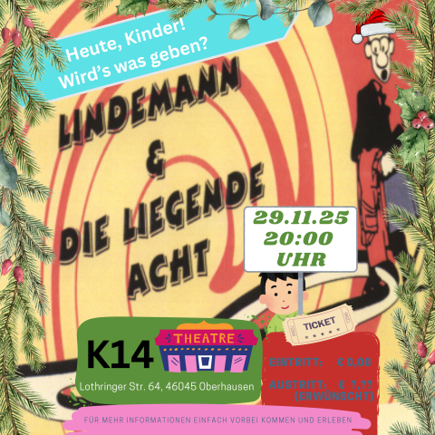 Im nunmehr 26. Jahr seit bestehen lädt Oberhausens erstes und noch immer einzigstes Impro-Theater zu einer nach Herzenslust improvisierten Weihnachtsshow ein. Es erwartet Dich ein großer Spaß mit großen Gefühlen, skurrilen Storys, absurden Ratespielen, ungehörten Liedern und anderen Szenen, die nie zuvor ein Mensch gesehen hat.