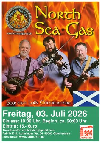 Seit über 39 Jahren und stärker denn je ! „North Sea Gas“ ist eine der beliebtesten Folkbands Schottlands mit großartigem Gesang und beeindruckendem dreistimmigen Harmoniegesang. Gitarre, Mandoline, Geige, Bouzouki, Mundharmonika, Pfeifen, Bodhrans, Banjo und gute Laune gehören zum Unterhaltungsprogramm. Sie wurden von der Scottish Music Industry Association mit Gold- und Silberschallplatten ausgezeichnet und spielen regelmäßig ausverkaufte Konzerte beim Edinburgh Festival Fringe und weltweit!